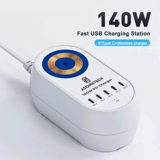 This versatile 6-in-1 station combines five USB-C ports and a wireless charging pad for maximum convenience. Equipped with advanced PD (Power Delivery) and PPS fast-charging protocols, it provides up to 140W total output — enough to charge laptops, tablets, smartphones, and accessories simultaneously. The intelligent power distribution ensures each connected device gets optimal current for the fastest, safest charge possible.
