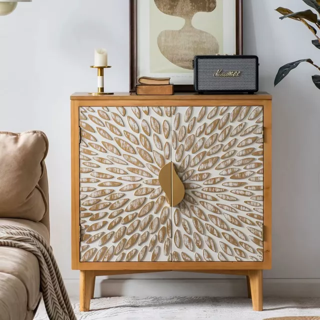 Infuse your living space with effortless bohemian charm and modern sophistication. The Boho Hand-Carved Sunburst Accent Cabinet is a statement piece designed to captivate at first glance. With its intricate hand-carved sunburst pattern radiating across natural wood tones, this cabinet adds texture, warmth, and artistic flair to any room. The brushed gold leaf handles shimmer subtly, offering a refined contrast that elevates your home décor with a touch of luxury.